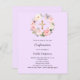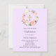 A lavender colored background, decorated with watercolored pink and white flowers in a wreath and a golden cross. Personalize and add a name and details.