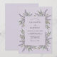 This design features a serene lavender purple backdrop adorned with delicate sprigs of fragrant lavender and soft sage green foliage. The botanical elements create an organic arrangement that evokes the peaceful atmosphere of the French countryside. This palette of light purple and muted green creates a timeless, aromatic aesthetic perfect for a summer or spring event.