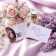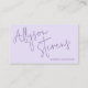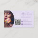A modern and bold simple lavender and purple makeup artist and hair stylist business card featuring oversized name at the front in a handwritten style font and photo, qr code and social media at the back on black. All the colors are editable.