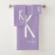 Minimalist but stylish, white personalised towel set with lavender initial letter monogram and name bellow the letter. A perfect gift or personal accessory that is easy to personalise (just click on the button 'PERSONALIZE this template').
