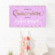 Featuring a gold print, lavender purple and white confetti design with an elegant script font, this quinceanera birthday banner is elegant and chic. Personalise with the birthday celebrant's name, event date, and welcome greeting.