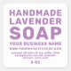 The Lavender Purple Handmade Soap Label features a clean, modern layout designed for artisan bath and body products. This square label highlights your business name, website, and full ingredient list in soft lavender purple against a crisp white background. Ideal for homemade soap bars, small-batch apothecary branding, farmers market packaging, and boutique gifting. A simple, elegant style that keeps your handcrafted products looking polished and professional.