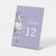 This lavender-purple wedding table number sign features white and purple watercolor peonies, lavender, geometric shapes, and typography. Ideal for an outdoor wedding. Find matching items in Lavender Purple Floral Wedding Collection.