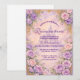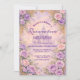 This romantic quinceañera design features a soft lavender and blush watercolor background framed by lush roses, delicate greenery, and elegant gold ornamental details. The floral border creates a dreamy garden atmosphere while maintaining a light, open center for clear, readable text when printed.