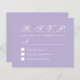 A simple, minimalist budget RSVP for a wedding. It has only white text on lavender (purple) background. The title RSVP and the letter M are written in an elegant calligraphic script, the rest in caps.