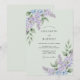 This design features a tranquil palette of muted sage green and soft lavender. Delicately painted watercolor blossoms and lush greenery create a serene botanical atmosphere. Cascading wisteria and leafy sprigs add a touch of natural elegance to the aesthetic. The overall mood is romantic and peaceful, perfect for a springtime event.