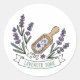 Add a calming botanical touch to your bath and body packaging with this lavender soak bath salt label featuring a wooden scoop filled with bath salts surrounded by delicate lavender sprigs.