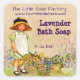 This lavender soap label features a little girl with a wheelbarrow full of flowers.