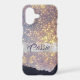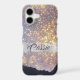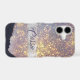 This pretty phone case for her features a violet lavender blue ragged edge swatch overlay that has a multitude of tiny gold star shines. Behind the image is a dark purple violet background. A silver paint strip holds your custom text, also in purple grey violet. Unique and eye-catching!