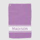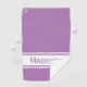 Play golf in style with this personalised golf towel. This design has a solid lavender (light purple) background colour with white stripes and a modern font. This is a terrific gift for women and girl golfers playing in golf tournaments or recreational golf. It's also a lovely gift for golf coaches and instructors. The name and colour can be customised in the personalisation options. Change colours to your favourite combination or match your golf bag or team colours.