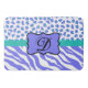 Decorate your bath or other room in your house with this colourful rug with your monogram. You will love this sophisticated and stylish combination of the popular wild african animal zebra stripe and leopard or cheetah skin design. This trendy periwinkle lavender purple and white zebra and leopard print pattern is available in several colour combinations. A periwinkle lavender emblem on a turquoise teal blue or aqua stripe creates a personalisation area for your monogram or name. This is fully customisable and is available on many coordinating products in this store.