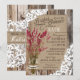 Rustic country western bridal shower card design with wine lavender flowers in mason jar with burlap and lace tied in twine and white lace over aged wood planks.