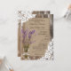 Rustic country western wedding invitation card design with lavender bouquet in mason jar wrapped with burlap, lace, and twine and white lace over linen-look background and aged wood planks and a heart etching with monogram at the back.