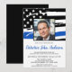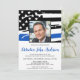 Thin Blue Line Police Retirement Invitations . Celebrate years of dedicated service, and invite friends and family to your law enforcement retirement party with this Thin Blue Line Flag Police Retirement Invitation. USA American flag design in Police Flag colors, modern trendy black white and blue design. This police officer retirement invitation is also perfect for police academy graduation invitations, change venue in personalization. See our collection for matching police retirement gifts, police retirement party favors, and supplies. COPYRIGHT © 2021 Judy Burrows, Black Dog Art - All Rights Reserved. Police Retirement Custom Photo Thin Blue Line Invitation