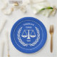 Law school grad party plates featuring creative scales-of-justice personified. To personalise edit text to add name of lawyer.