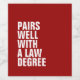 Want to know what this wine pairs well with? A law degree! Celebrate a law school graduation with this fun wine label. Anything goes on this hilarious customisable wine label! Great for a friend gift, your classmates and more. The funny wording is up to you or you can leave it as-is to read "pairs well with a law degree." Other colours also available