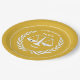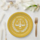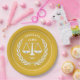 Law school grad party plates featuring creative scales-of-justice personified. To personalise edit text to add name of lawyer.