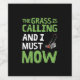 Funny lawn mower design that reads: The Grass Is Calling and I Must Mow.