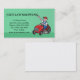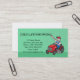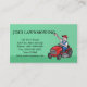 Business card ideal for lawn mowing services showing illustration of a gardener landscaper riding on ride-on mower mowing lawn done in cartoon style .