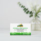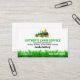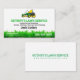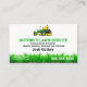 Lawn service business card. with a green and yellow zero turn lawnmower on it.