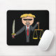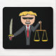 A lawyer stands holding the sword or truth and the scales of justice. Wears shades instead of a blindfold and a big toothy grin.