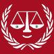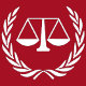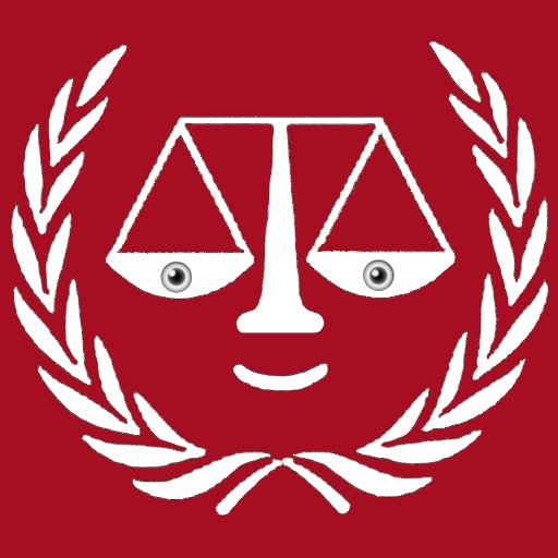 Funny lawyer button featuring cartoon scales of justice on red background.
