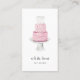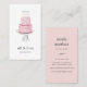 Elegant vertical business cards for your bakery, patisserie or cake decorating business feature a watercolor layer cake illustration in pink and white, with two lines of custom text beneath for your name and business name or profession. Add your contact information to the reverse side on a sugary pastel blush pink background