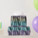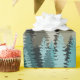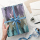 An illustration of layered pine trees arranged in horizontal bands, featuring cool teal, lavender, olive, and charcoal shades.