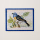 Puzzle (various sizes) with the Lazuli Bunting Bird in blue, yellow, black, and white on colourful background of green leaves and branch.  Looks like an audubon image.
