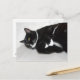 Postcard with cute lazy black and white tuxedo cat lying on a table