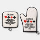 Bridge players will enjoy this oven mitt and pot holder set featuring the four card suits along with the following bridge truism saying: "Leads Provide Significant Clues About Where Key Cards Lie". Memorable bridge advice oven mitt and pot holder set for any bridge player who is frequently on defence and who tries to assess where the key cards lie!