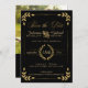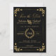 "Gold Laurel Leaf Greenery Black Save the Date Photo Engagement Announcement." Bold modern and elegant typography style 5 x 7 format in rich ebony black with gold glitter look leaf foliage corners and a laurel leaf wreath. Your engagement photo is easily changed out using the template field provided. Art and design by internationally licensed artist, Audrey Jeanne Roberts, copyright.