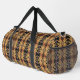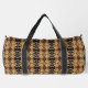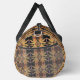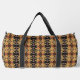 The original pattern by HomeWare on this Duffel Bag was made from an original closeup photograph of a leaf on a young coral plant. After a shift in colour, the leaves looks reddish gold and the flower pots have become purple, all against a dark brown and green background. In the pattern, the lavender purple colour in the photo is used as linear borders between the bands of leaves.