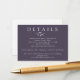 A wedding invitation insert card to provide further details for your guests, featuring a single watercolor blue leaves stem and white text, on a slate/navy blue background. Other items in this design are available.