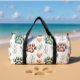 This cute design duffle bag features coloured paw prints in brown and green, interwoven with leafy patterns and subtle heart design elements, all on a clean white background. It's a practical pet accessory and versatile carrier for travel and everyday use.