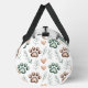 This cute design duffle bag features coloured paw prints in brown and green, interwoven with leafy patterns and subtle heart design elements, all on a clean white background. It's a practical pet accessory and versatile carrier for travel and everyday use.
