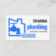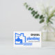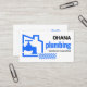 An all white cover features blue home building frame that is leaking water. Card details are over on the right with your prestigious name at the top followed by the business name "plumbing" and a slogan caption option; Change the captions to these items to suit your own service needs. Overleaf, at the top is the blue leaking faucet logo you can use followed by your prestigious name and the contact details.
