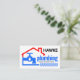Cover features a home building frame that is leaking water from the faucet. Card details are over on the right with your prestigious name at the top followed by the business name "plumbing" in blue and a slogan caption option; Change the captions to these items to suit your own service needs. Overleaf, at the top is the blue faucet logo you can use followed by your prestigious name and the contact details.