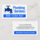 Cover features a leaking faucet design in blue water waves. Over at the top is the oversize business name "Plumbing Services" which you can change. Near the base of the card is the phone contact inside a blue layer.