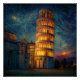 This expressive painting depicts the illuminated Leaning Tower of Pisa at night, set against a dramatically swirling, textured sky in the style of Van Gogh.