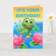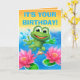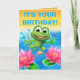 Leap Frog birthday card customisable message. One of my favourite illustrations. This little leaping frog loves birthdays and parties so much that he's jumping right out of the picture. Perfect for any kid's party ware, you'll find her on cards, invites and plates and various kids apparel. All with customisable ages and names for the perfect tailored party.