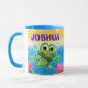 Leaping frog party custom NAME ceramic combo mug. Leaping frog party custom ceramic mug gift. One of my favourite illustrations. This little leaping frog loves birthdays and parties so much that he's jumping right out of the picture. Perfect for any kid's party ware, you'll find her on cards, invites and plates and various kids apparel. All with customisable ages and names for the perfect tailored party.
