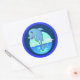 A cartoon illustration of a cute dolphin jumping out of the ocean in shades of blue and green. Sticker has a wide border in blue with a wavy pattern in varying shades of blue.