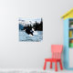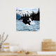 Two leaping killer whales before the untouched wilderness of the British Columbia coast. Originally in watercolor.