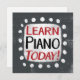 "Learn Piano Today" is a cute text design in grey with black and red text. It sits on a white accent shape and cute white polka dots surrounding it.