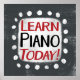 "Learn Piano Today" is a cute text design in grey with black and red text. It sits on a white accent shape and cute white polka dots surrounding it.