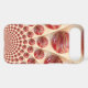 The artwork showcases a central cluster of red cricket balls that radiates outwards in a concentric, spiralling fashion. The balls vary in size, suggesting depth and perspective. The background is a soft, textured off-white, providing a subtle contrast that highlights the rich red of the cricket balls. The overall effect is visually engaging and creates a sense of organised yet dynamic movement.
