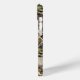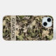 Customize this leaves camouflage iPhone 15 plus case with your name in a trendy modern CAP font in brown on opaque cream. It's masculine and perfect for your favorite military, hunting, country or outdoorsman!