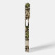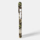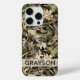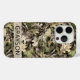 Customize this leaves camouflage iPhone 15 pro case with your name in a trendy modern CAP font in brown on opaque cream. It's masculine and perfect for your favorite military, hunting, country or outdoorsman!