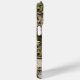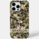 Customize this leaves camouflage iPhone 15 pro max case with your name in a trendy modern CAP font in brown on opaque cream. It's masculine and perfect for your favorite military, hunting, country or outdoorsman!